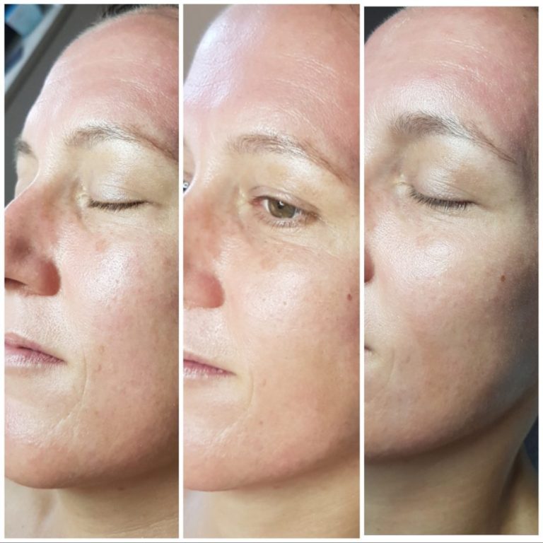 Hier sieht man den Effekt im Vergleich - vor der ersten Behandlung und nach der dritten Behandlung. Die Falten wurden reduziert. Der Glow Effekt ist deutlich zu erkennen.
